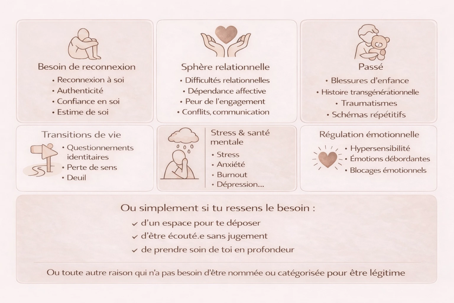 Je t’accueille dans un cadre sécurisant, où tu peux venir tel·le que tu es.